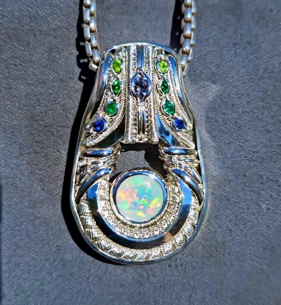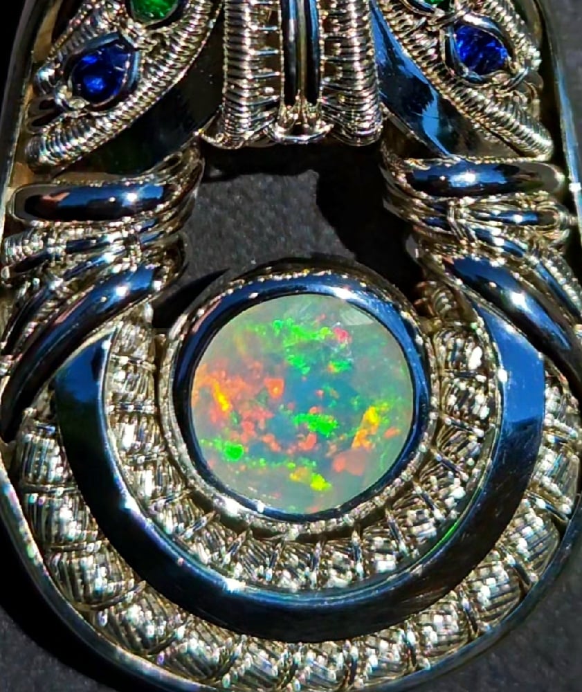 African Opals don't often show up in my work, but this stone was exceptional. Stunning colors with bright and complex movement, accented with the most brightest blue, green, and purple gems from across Africa and Asia.