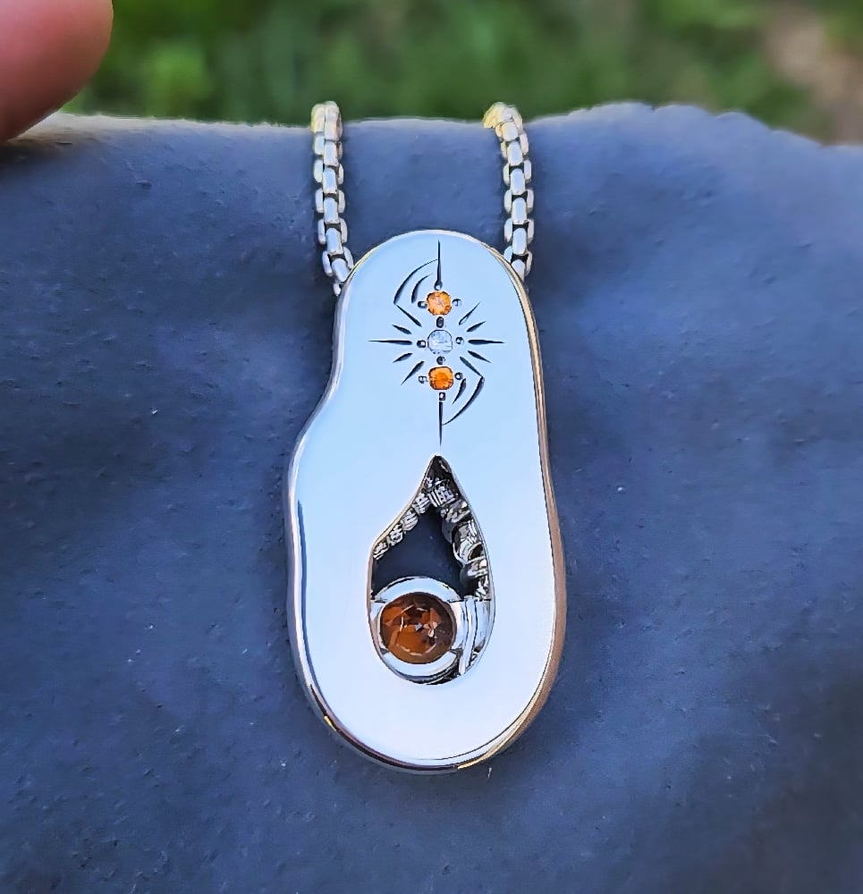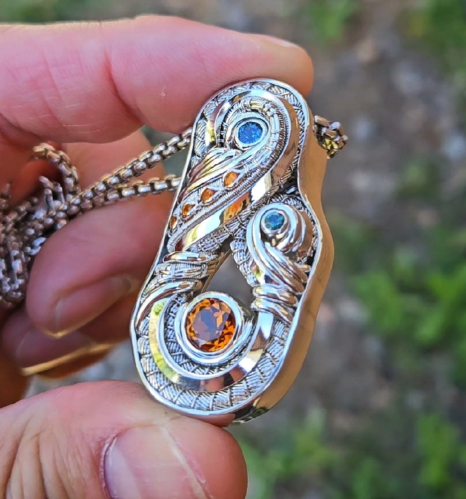 A blend of Ocean Blues and Bright Tangerine Orange, brought out by lustrous mirror finish Sterling Silver. I dont often use Orange in my artwork, but when I do you can be sure its an exceptional example of what mother nature can produce.